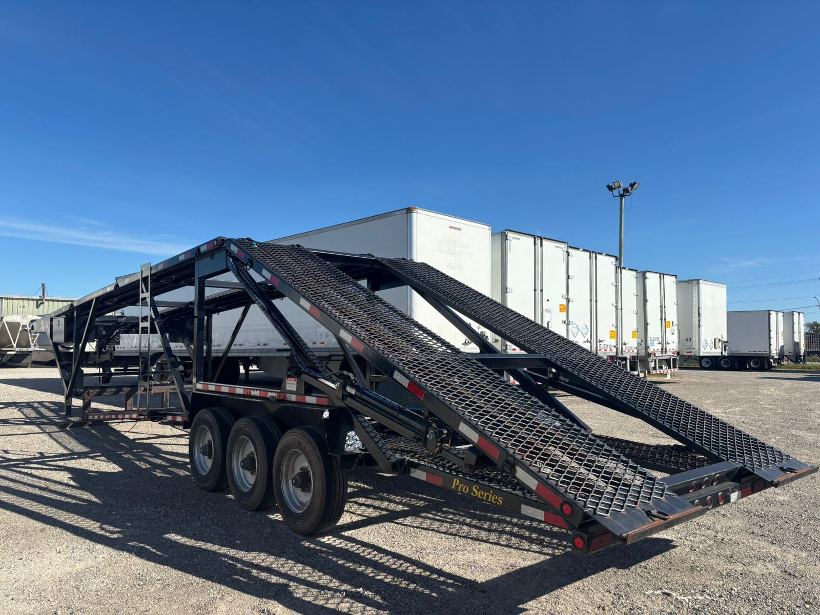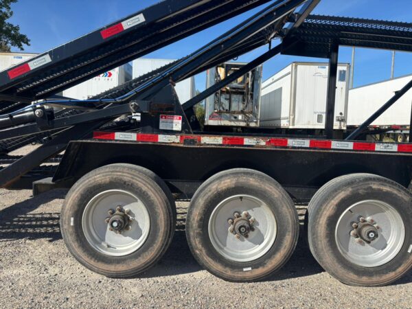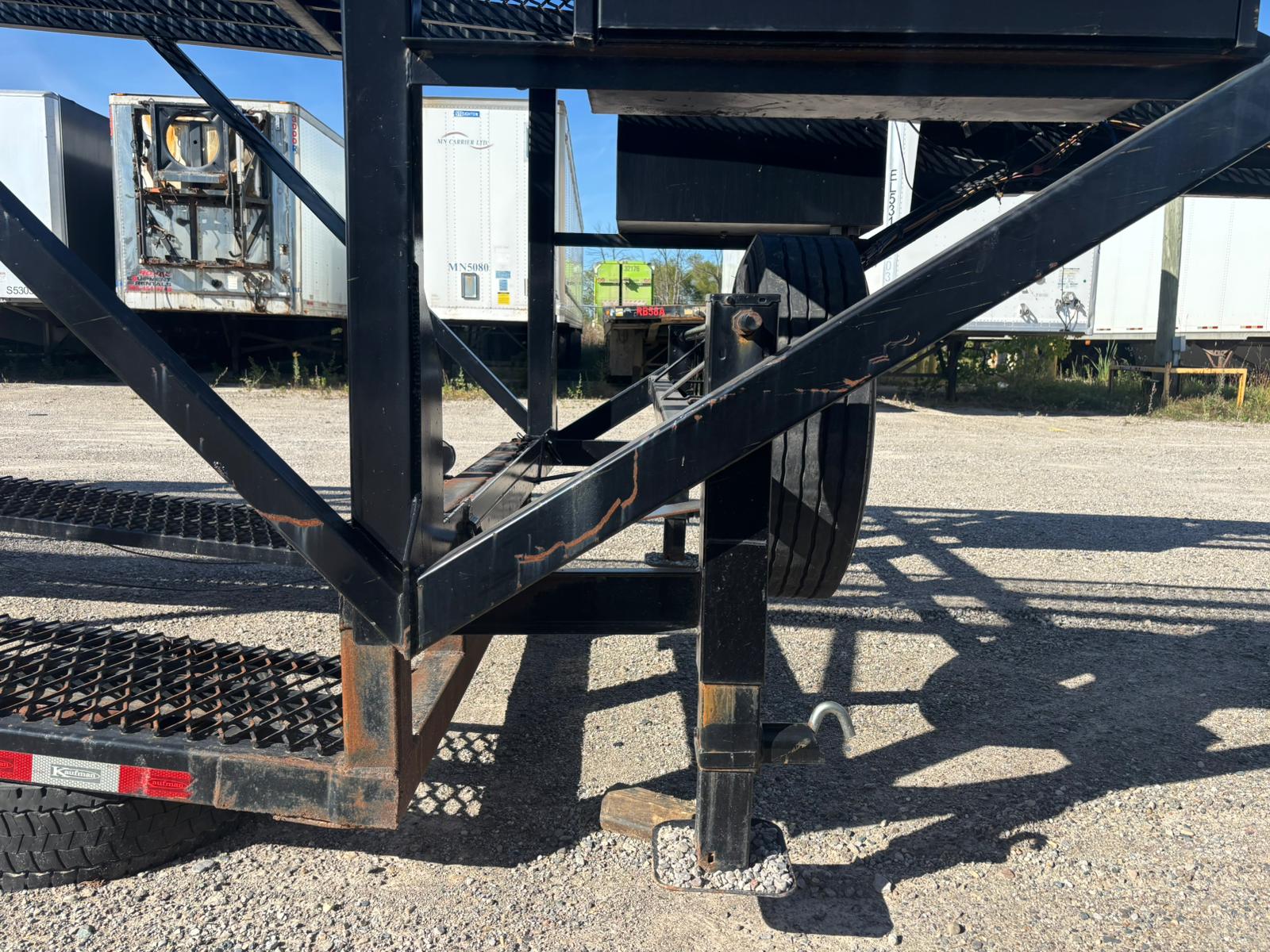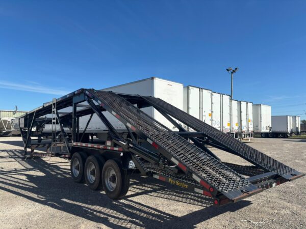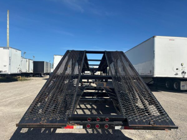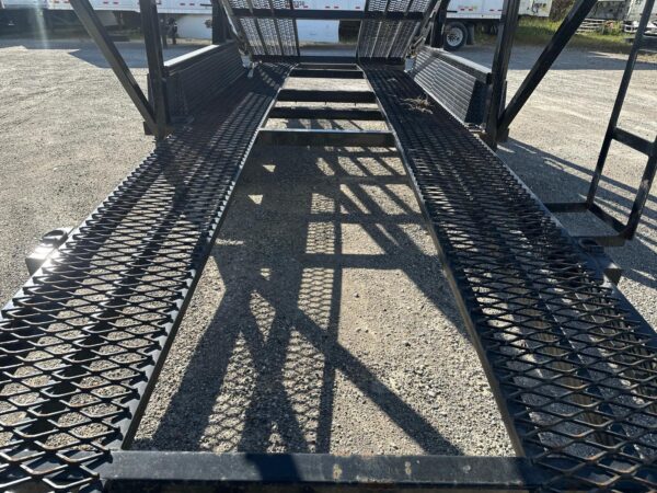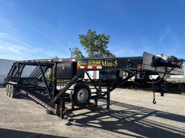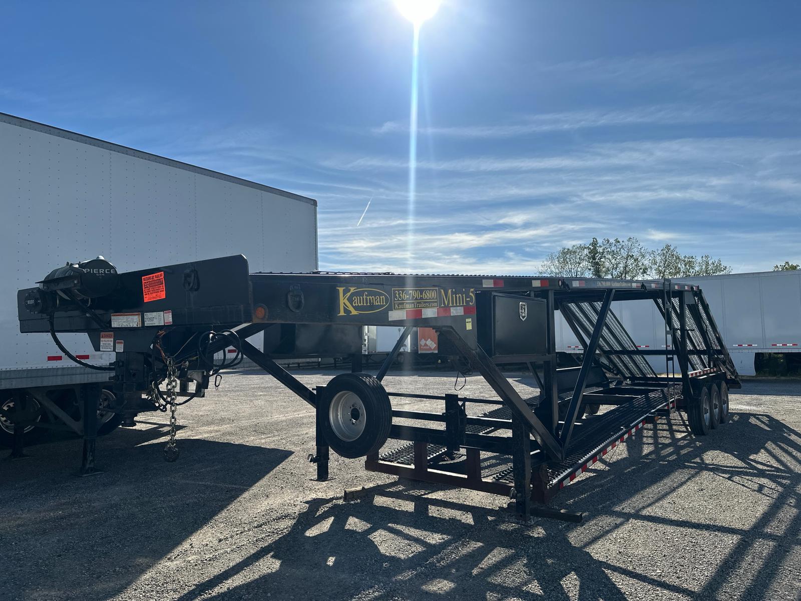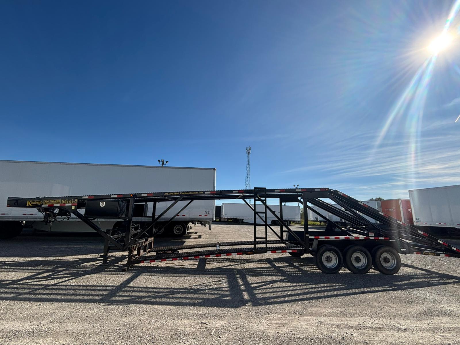 KAUFMAN MINI-5 CAR HAULER with Deck Length: 44’10”, Deck Height: 94″, Deck Width: Lower 80″ & Upper 98″, Three 8,000 lbs axles, 5′ Dovetail, 4″ x 3″ tubular steel frame, 16,250 lbs Load Capacity with hitch weight of 8,000 lbs, Heavy Duty Steel Wheels, Metal runner floor, Heavy duty Safety Chains, 10 feet Aluminum Ramps